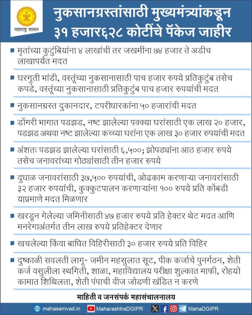या पॅकेजमध्ये कोरडवाहू, हंगामी बागायत आणि बागायत पिकांसाठी ₹ १८,५०० ते ₹ ३२,५०० प्रति हेक्टर (३ हेक्टरपर्यंत) पर्यंत थेट मदत जाहीर करण्यात आली आहे.