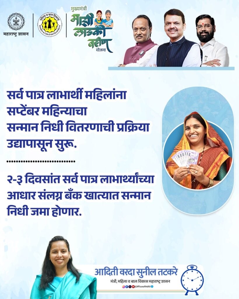 Ladaki Bahin Payment: लाडकी बहीण योजना: सप्टेंबरचा सन्मान निधी उद्यापासून वितरित होणार!